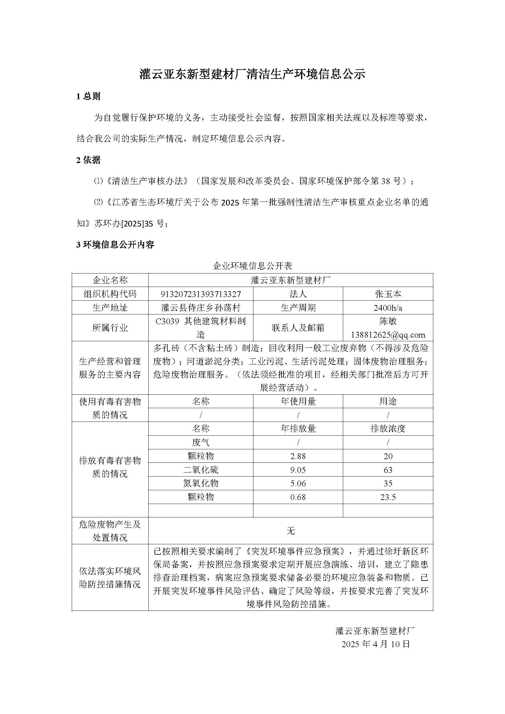 为深入推进连云港市污染物减排工作,根据《江苏省生态环境厅关于公布2025年第一批强制性清洁生产审核重点企业名单的通知》苏环办[2025]35号,公司须实施清洁生产审核。现将公司基本情况公示如下 :